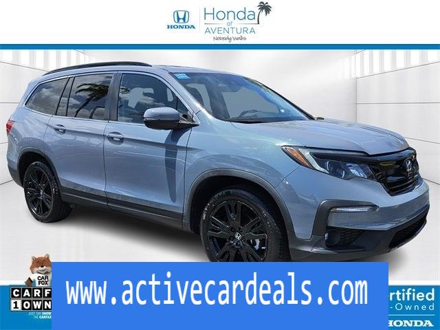 Honda of Aventura is proud to present you with another True Market Priced Pre-Owned Vehicle. This 2022 Honda Pilot Special Edition HondaTrue Certified is loaded with the following Factory Options: HondaTrue Certified Certified, 3rd row seats: split-bench, 4-Wheel Disc Brakes, 4.33 Axle Ratio, 7 Speakers, A/V remote: CabinControl, ABS brakes, Air Conditioning, Alloy wheels, AM/FM radio: SiriusXM, Apple CarPlay/Android Auto, Auto High-beam Headlights, Auto-dimming Rear-View mirror, Automatic temperature control, Blind Spot Information (BSI) System warning, Brake assist, Bumpers: body-color, Delay-off headlights, Driver door bin, Driver vanity mirror, Dual front impact airbags, Dual front side impact airbags, Electronic Stability Control, Emergency communication system: HondaLink Assist, Exterior Parking Camera Rear, Forward collision: Collision Mitigation Braking System (CMBS) + FCW mitigation, Four wheel independent suspension, Front anti-roll bar, Front Bucket Seats, Front Center Armrest, Front dual zone A/C, Front fog lights, Front reading lights, Fully automatic headlights, Garage door transmitter: HomeLink, Heated door mirrors, Heated Front Bucket Seats, Heated front seats, Illuminated entry, Lane departure: Lane Keeping Assist System (LKAS) active, Leather Seat Trim, Low tire pressure warning, Memory seat, Occupant sensing airbag, Outside temperature display, Overhead airbag, Overhead console, Panic alarm, Passenger door bin, Passenger vanity mirror, Power door mirrors, Power driver seat, Power Liftgate, Power moonroof, Power passenger seat, Power steering, Power windows, Radio data system, Radio: 215-Watt Audio System, Rear air conditioning, Rear anti-roll bar, Rear reading lights, Rear seat center armrest, Rear window defroster, Rear window wiper, Reclining 3rd row seat, Remote keyless entry, Roof rack: rails only, Security system, Speed control, Speed-sensing steering, Speed-Sensitive Wipers, Split folding rear seat, Spoiler, Steering wheel mounted audio controls, Tachometer, Telescoping steering wheel, Tilt steering wheel, Traction control, Trip computer, Turn signal indicator mirrors, Variably intermittent wipers, and Wheels: 20 Exclusive Gloss Black Alloy!!CARFAX One-Owner. Clean CARFAX.Certified. HondaTrue Certified Details: * Roadside Assistance * 182 Point Inspection * Transferable Warranty * Warranty Deductible: $0 * Powertrain Limited Warranty: 84 Month/100,000 Mile (whichever comes first) from original in-service date * Vehicle History * Vehicles purchased within New Vehicle Limited Warranty period: extends New Vehicle Limited Warranty to 5 years*/60,000 miles*. Honda Care Roadside Assistance for 2 year/100,000 miles (whichever occurs first). Up to two complimentary oil changes within the first year of ownership. SiriusXM 90-Day Trial. * Limited Warranty: 24 Month/100,000 Mile (whichever comes first) after new car warranty expires or from certified purchase dateAnother way Honda of Aventura takes care of its customers is through our green light program. Regardless of whether you have a credit history with bankruptcy, poor credit, or foreclosures, and even if you’re simply a first-time buyer and have limited credit history, our finance department can easily get you set up with a loan. And when you come in for service, we promise to get you in, out, and back on the road quickly and efficiently thanks to our price guarantee—your oil change will be complete within 45 minutes, or it’s on us!Simply come to Honda of Aventura today to start a quick and straightforward car buying process. Our dealership is located at 2150 NE 163rd Street in North Miami Beach, FL, and you can contact our sales team with any questions!