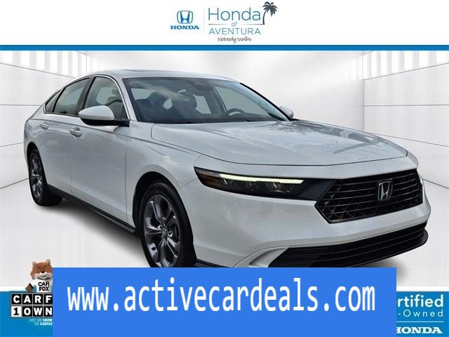 Black w/Fabric Seat Trim.Honda of Aventura is proud to present you with another True Market Priced Pre-Owned Vehicle. This 2024 Honda Accord EX HondaTrue Certified is loaded with the following Factory Options: Black w/Fabric Seat Trim HondaTrue Certified Certified, Black w/Fabric Seat Trim, 4-Wheel Disc Brakes, 8 Speakers, ABS brakes, Adaptive Cruise Control: Adaptive Cruise Control (ACC) with Low-Speed Follow, Air Conditioning, Alloy wheels, AM/FM radio, Apple CarPlay/Android Auto, Auto High-beam Headlights, Auto-dimming Rear-View mirror, Automatic temperature control, Blind Spot Information (BSI) System warning, Brake assist, Bumpers: body-color, Compass, Delay-off headlights, Driver door bin, Driver vanity mirror, Dual front impact airbags, Dual front side impact airbags, Electronic Stability Control, Emergency communication system: HondaLink Assist, Exterior Parking Camera Rear, Fabric Seat Trim, Four wheel independent suspension, Front anti-roll bar, Front Bucket Seats, Front Center Armrest, Front dual zone A/C, Front reading lights, Fully automatic headlights, Heated Front Bucket Seats, Heated front seats, Illuminated entry, Knee airbag, Lane departure: Lane Keeping Assist System (LKAS) active, Low tire pressure warning, Occupant sensing airbag, Outside temperature display, Overhead airbag, Overhead console, Panic alarm, Passenger door bin, Passenger vanity mirror, Power door mirrors, Power driver seat, Power moonroof, Power steering, Power windows, Radio data system, Radio: 180-Watt AM/FM Audio System, Rear anti-roll bar, Rear reading lights, Rear seat center armrest, Rear side impact airbag, Rear window defroster, Remote keyless entry, Security system, Speed control, Speed-sensing steering, Speed-Sensitive Wipers, Split folding rear seat, Steering wheel mounted audio controls, Tachometer, Telescoping steering wheel, Tilt steering wheel, Traction control, Trip computer, Variably intermittent wipers, and Wheels: 17 x 7.5 Pewter Gray!!CARFAX One-Owner.Certified. HondaTrue Certified Details: * Limited Warranty: 24 Month/100,000 Mile (whichever comes first) after new car warranty expires or from certified purchase date * Transferable Warranty * 182 Point Inspection * Vehicle History * Powertrain Limited Warranty: 84 Month/100,000 Mile (whichever comes first) from original in-service date * Roadside Assistance * Vehicles purchased within New Vehicle Limited Warranty period: extends New Vehicle Limited Warranty to 5 years*/60,000 miles*. Honda Care Motor Club Partner for 1 year/12,000 miles. Up to two complimentary oil changes within the first year of ownership. SiriusXM 90-Day Trial. * Warranty Deductible: $0Another way Honda of Aventura takes care of its customers is through our green light program. Regardless of whether you have a credit history with bankruptcy, poor credit, or foreclosures, and even if you’re simply a first-time buyer and have limited credit history, our finance department can easily get you set up with a loan. And when you come in for service, we promise to get you in, out, and back on the road quickly and efficiently thanks to our price guarantee—your oil change will be complete within 45 minutes, or it’s on us!Simply come to Honda of Aventura today to start a quick and straightforward car buying process. Our dealership is located at 2150 NE 163rd Street in North Miami Beach, FL, and you can contact our sales team with any questions!