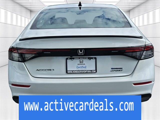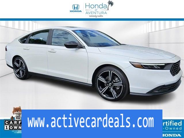 2.0L 16V DOHC.Honda of Aventura is proud to present you with another True Market Priced Pre-Owned Vehicle. This 2024 Honda Accord Hybrid Sport LOW MILES /CERTIFIED HondaTrue Certified is loaded with the following Factory Options: 2.0L 16V DOHC HondaTrue Certified Certified, 2.0L 16V DOHC, 4-Wheel Disc Brakes, 8 Speakers, ABS brakes, Adaptive Cruise Control: Adaptive Cruise Control (ACC) with Low-Speed Follow, Air Conditioning, Alloy wheels, AM/FM radio, Apple CarPlay/Android Auto, Auto High-beam Headlights, Automatic temperature control, Blind Spot Information (BSI) System warning, Brake assist, Bumpers: body-color, Compass, Delay-off headlights, Driver door bin, Driver vanity mirror, Dual front impact airbags, Dual front side impact airbags, Electronic Stability Control, Emergency communication system: HondaLink, Exterior Parking Camera Rear, Fabric Seat Trim, Four wheel independent suspension, Front anti-roll bar, Front Bucket Seats, Front Center Armrest, Front dual zone A/C, Front reading lights, Fully automatic headlights, Illuminated entry, Knee airbag, Lane departure: Lane Keeping Assist System (LKAS) active, Leather Shift Knob, Leather steering wheel, Low tire pressure warning, Occupant sensing airbag, Outside temperature display, Overhead airbag, Overhead console, Panic alarm, Passenger door bin, Passenger vanity mirror, Power door mirrors, Power driver seat, Power moonroof, Power steering, Power windows, Radio data system, Radio: 180-Watt Audio System, Rear anti-roll bar, Rear reading lights, Rear seat center armrest, Rear side impact airbag, Rear window defroster, Remote keyless entry, Security system, Speed control, Speed-sensing steering, Speed-Sensitive Wipers, Split folding rear seat, Spoiler, Steering wheel mounted audio controls, Telescoping steering wheel, Tilt steering wheel, Traction control, Trip computer, Variably intermittent wipers, and Wheels: 19 x 8.5J Berlina Black!!CARFAX One-Owner.Certified. HondaTrue Certified Details: * Warranty Deductible: $0 * Roadside Assistance * Powertrain Limited Warranty: 84 Month/100,000 Mile (whichever comes first) from original in-service date * Limited Warranty: 24 Month/100,000 Mile (whichever comes first) after new car warranty expires or from certified purchase date * 182 Point Inspection * Transferable Warranty * Vehicles purchased within New Vehicle Limited Warranty period: extends New Vehicle Limited Warranty to 5 years*/60,000 miles*. Honda Care Roadside Assistance for 2 year/100,000 miles (whichever occurs first). Up to two complimentary oil changes within the first year of ownership. SiriusXM 90-Day Trial. * Vehicle HistoryAnother way Honda of Aventura takes care of its customers is through our green light program. Regardless of whether you have a credit history with bankruptcy, poor credit, or foreclosures, and even if you’re simply a first-time buyer and have limited credit history, our finance department can easily get you set up with a loan. And when you come in for service, we promise to get you in, out, and back on the road quickly and efficiently thanks to our price guarantee—your oil change will be complete within 45 minutes, or it’s on us!Simply come to Honda of Aventura today to start a quick and straightforward car buying process. Our dealership is located at 2150 NE 163rd Street in North Miami Beach, FL, and you can contact our sales team with any questions!